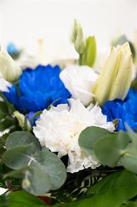 Jokainen kimppu sidotaan käsityönä kukkakaupassamme tuoreista kauden kukista. Kukkalajit voivat vaihdella sesongin ja saatavuuden mukaan, mutta kimpun sinivalkoinen ilme ja harmoninen tyyli säilyvät aina.